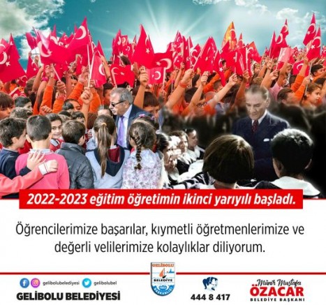 2022-2023 eğitim öğretim yılının ikinci yarıyılı dün başladı. Belediye Başkanı Mustafa Özacar, eğitim öğretimin ikinci yarıyılının başlaması nedeniyle bir mesaj yayımlayarak, tüm öğrenci, öğretmen ve velilere başarılı bir dönem diledi.
