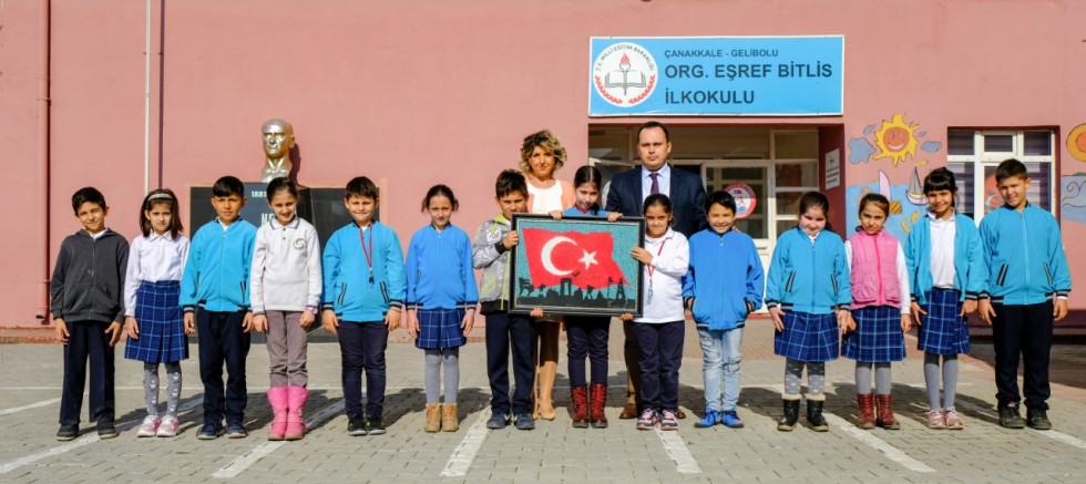 Çalışmalarında öğütülmüş deniz kabukları ve renkli kum boya kullandılar. Tasarımda şanlı bayrağımız ile birlikte çalışmanın zemin kısmında, mitolojik en zekice savaş hamlesi “Truva Atı “ 18 Mart Çanakkale Deniz Zaferi kahramanlarından “Seyit Onbaşı” Çanakkale Savaşları’nda Yarbay Mustafa Kemal’in “Ben size taarruz emretmiyorum, ölmeyi emrediyorum!” sözüyle canlarını ortaya koyarak düşmanın üzerine yürüyen ve adını tarihe “Kahraman Birlik” olarak altın harflerle yazdıran 19.Tümen’e bağlı 57. Alay’ın Şehitliği ve “Çanakkale Geçilmez” destanını yazan binlerce kahramanın anıtı Çanakkale Şehitler Abidesi silüetlerini kullandılar. Bu tasarım ile bayrağımız, e Twinning “ 81 İlde Şanlı Bayrağımız” projesi bünyesinde “ 12 Mart İstiklal Marşı’nın Kabulü” ile “18 Mart Çanakkale Zaferi ve Şehitleri Anma Günü” programlarında sergilenmek üzere Konya’nın Çumra ilçesine yollanacaktır. Görsel Sanatlar dersini çok seven öğrencilerimiz, proje bünyesinde konu “Şanlı Türk Bayrağımız” olunca çok heyecanlandılar ve son derece titiz bir çalışma sergilediler.