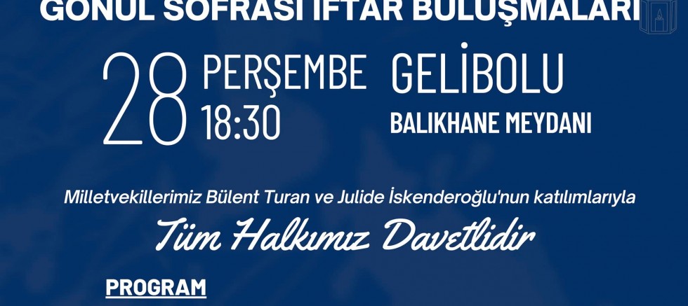 AK Parti İl Başkanlığı tarafından, “Gönül Sofrası İftar Buluşmaları” adı altında, ilçe ilçe iftar programları organize edilmeye devam ediyor. AK Parti İlçe Başkanlığı tarafından yapılan duyuruda, 28 Nisan Perşembe günü ilçemizde iftar buluşmaları düzenleneceği belirtildi.
