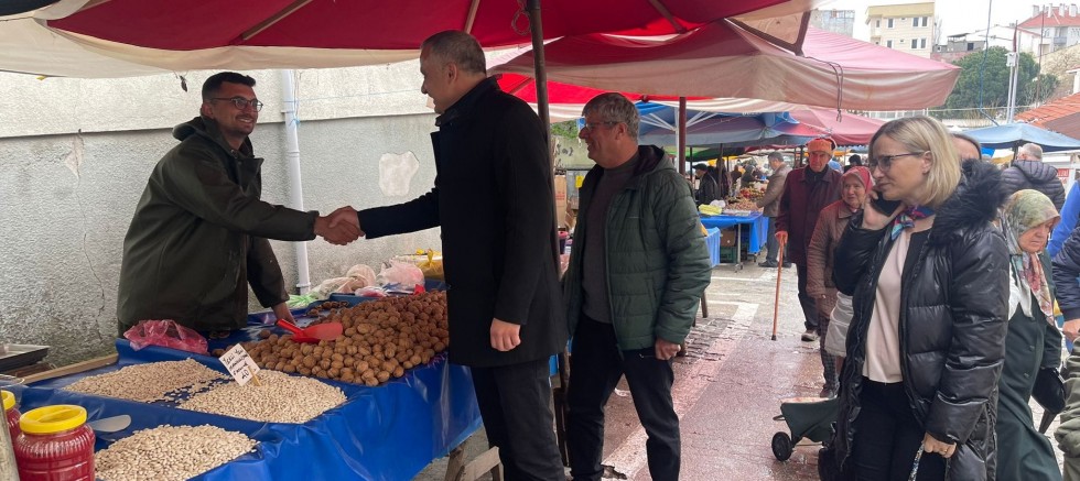 AK Parti İl Genel Meclis Üyesi ve İlçe Başkanı Serhad Sürücü, Kadın Kolları Başkanı Aytaç Boyacı ve İlçe Yönetim Kurulu Üyeleriyle birlikte pazarcı esnafını ziyaret ederek, hayırlı işler diledi. Pazara alışveriş yapmaya gelen vatandaşlarla da görüşen AK Parti İlçe Teşkilatı, esnafın ve vatandaşların sorunlarını dinledi. AK Parti İl Genel Meclis Üyesi ve İlçe Başkanı Serhad Sürücü, pazar esnafı ziyareti ile ilgili; “Bu yağmurlu günde tezgahını bırakmayan pazar esnafımıza hayırlı işler bereketli kazançlar diledik” dedi.