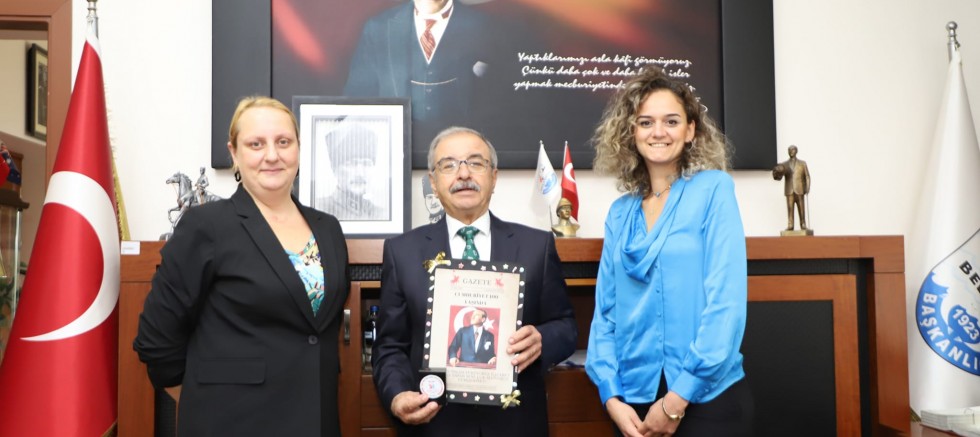Şehit Öğretmen Aybüke Yalçın Anaokulu Müdürü Hatice Özen ve okul öğretmeni, ilçemiz Belediye Başkanı Mustafa Özacar’ı makamında ziyaret etti. Okul Müdürü Hatice Özen ve kendisine eşlik eden okul öğretmeni, minik öğrencilerin hazırladığı anı gazetesini Belediye Başkanı Mustafa Özacar’a hediye etti. Belediye Başkanı Mustafa Özacar, ziyaretten duyduğu memnuniyeti dile getirerek; “Kendilerine ziyaretleri ve Cumhuriyetin 100. yılına özel minik eller tarafından özenle hazırlanan anı gazetesi hediyeleri için teşekkür ediyorum” dedi.