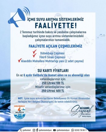 Gelibolu Belediyesi tarafından ilçedeki içme suyu arıtma sistemlerinde yapılan bakım ve yenileme çalışmaları tamamlandı. Arıtma sistemlerinin yeniden faaliyete geçmesi ile birlikte su kartı fiyatlarında da indirim gerçekleştirildi.