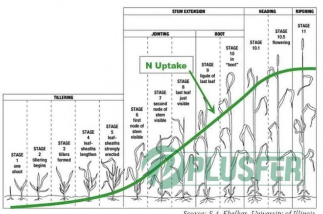 Çiftçilik takvimden bağımsız ilerleyen bir meslektir. Yani bu işte şubatın başı, nisanın sonu gibi standart bir takvime dayalı iş yapılmaz. Buğdayın gövdesinde boğumların oluştuğu (fotoğrafta “Stage 6” olarak belirtilen) dönem azot ihtiyacının hızla arttığı dönemin başlangıcıdır. Bu dönem, bir anlamda farklılaşma ( olgunlaşma ) diyebileceğimiz adımlarından birisidir. Bu ana kadar bitki tohum üretme altyapısı için hazırlık yaparken boğum oluşumu ile birlikte artık bu altyapı hazırlıkları icraata geçiyor diyebiliriz. Bu sebeple mikro element beslemesi bu dönemde önce yapılmış/başlamış olmalı. Aynı durum azot içinde geçerlidir.