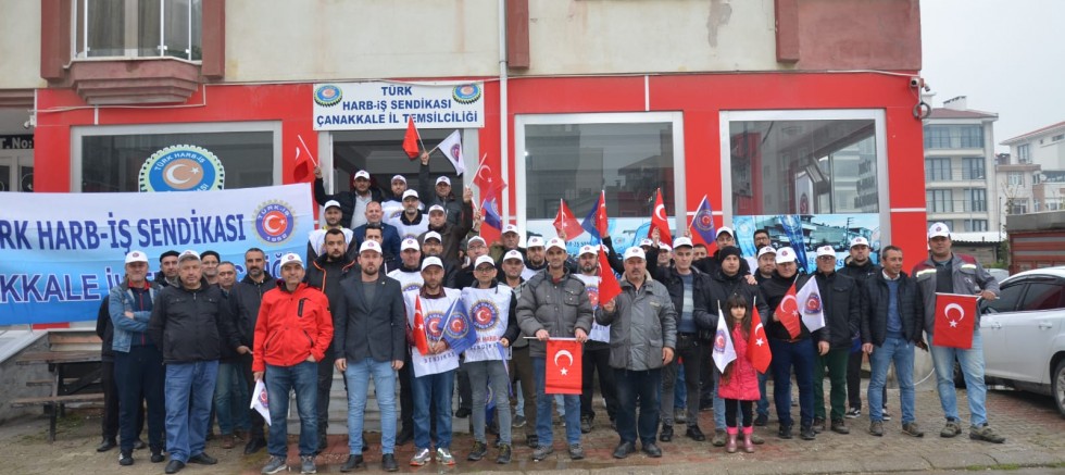 Türk Harb-İş Sendikası Çanakkale İl Temsilcisi Erdinç Arslan, yaptığı basın açıklamasında şu ifadelere yer verdi; “Biz Türk Harb-İş Sendikası üyesi, Milli Savunma ve İçişleri Bakanlığına bağlı askeri işyerlerinde çalışan işçiler olarak “Söz Konusu Vatansa Gerisi Teferruattır” düsturuyla hareket ederek vatan ve millet sevgisiyle ülkemizin her noktasında görev yapmaktayız. Bugün tankların ve kara araçlarının bakım ve onarımını yaparak her zaman göreve hazır olmalarını sağlayan, istikbalin olduğu mavi göklerde uçaklarımızı uçuran, sınırımızı koruyan fırtınaların üretimini yapan, mavi vatanımızın sularında seyreden gemilerimizin ve denizaltılarımızın üretimini, bakımını ve onarımını yaparak onları her daim göreve hazır tutan biz savunma sanayi işçileri; ülkemiz ve sınır ötesi de dahil olmak üzere bize ihtiyaç duyulan her yerde görevimizi ifa etmekteyiz.