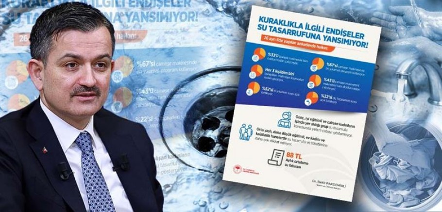 Tarım ve Orman Bakanlığı'nın toplumdaki su tüketim alışkanlıklarını belirlemek amacıyla Türkiye temsiliyeti gözetilerek 26 ilde yaptırdığı araştırmaya göre, ankete katılanların yüzde 89'u gelecekte susuzluk yaşanabileceğini düşünüyor ancak bu endişe su tasarrufuna yansımıyor.