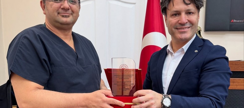 Gelibolu Şehit Koray Onay Devlet Hastanesi Başhekimi Op. Dr. Burak Demirca, Belediye Başkanı Ali Kamil Soyuak’a hastaneye yaptığı yardımlardan ötürü plaket verdi.