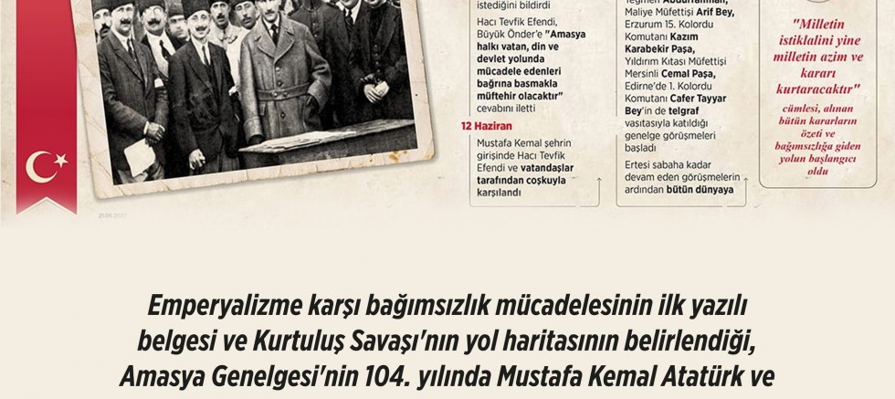 İlçemiz Belediye Başkanı Mustafa Özacar, tam bağımsız Türkiye Cumhuriyeti'nin temellerini oluşturan ilk kuruluş belgesi niteliğindeki Amasya Genelgesi'nin 104. yılı nedeniyle bir mesaj yayımladı.