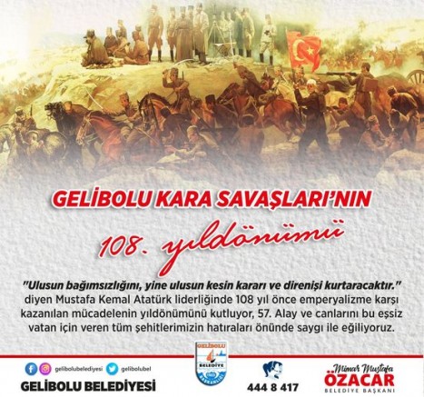 İlçemiz Belediye Başkanı Mustafa Özacar, 24 Nisan 1915'de başlayan ve zaferle sonuçlanan Gelibolu Kara Savaşları'nın 108. yıldönümü nedeniyle bir mesaj yayımladı.