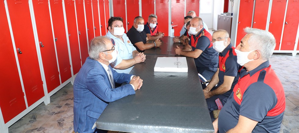 İtfaiye Müdürü Serhat Fırat ve nöbetçi vardiyadaki personeli ile sohbet edip kendilerine tatlı ikramında bulunan Başkan Özacar, “Vatandaşlarımızın canını ve malını koruyan ve zor bir görevi ifa eden siz değerli arkadaşlarımıza bugüne kadar yapmış olduğunuz hizmetlerden dolayı teşekkür ediyoruz.” dedi.