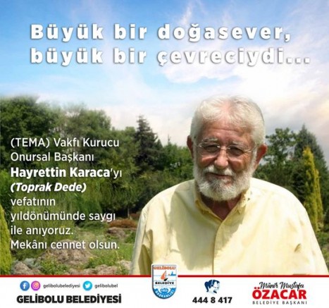 İlçemiz Belediye Başkanı Mustafa Özacar, çevre bilincini nesillere aktaran ve yaşamını toprağa, suya ve ağaçlara adayan, doğa savunucusu TEMA Vakfı Kurucu Onursal Başkanı Hayrettin Karaca’nın vefatının yıldönümü nedeniyle bir mesaj yayımladı.