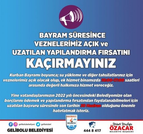 Gelibolu Belediyesi tarafından Kurban Bayramı süresince veznelerin açık olacağı duyurularak; “Kurban Bayramı boyunca; su yükleme ve diğer tahsilatlarınız için veznelerimiz açık olacak olup, ek hizmet binamızda 10.00-17.00 saatleri arasında değerli halkımıza hizmet vereceğiz.