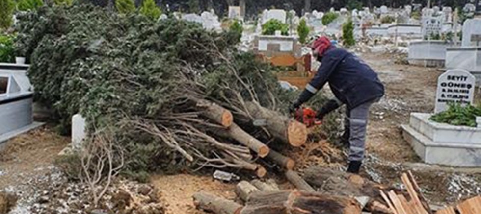 Hafta sonu ile Pazartesi günü bölgemizde etkili olan şiddetli fırtına nedeniyle meydana gelen olumsuzlukları ortadan kaldırmak için yoğun çalışmalarını sürdüren Destek Hizmetleri Müdürlüğü’ne bağlı ekipler, Aleaddin Kalfa Mezarlığı’nda devrilen ağaçları yerinden kaldırarak, temizlik çalışmaları gerçekleştirdiler.
