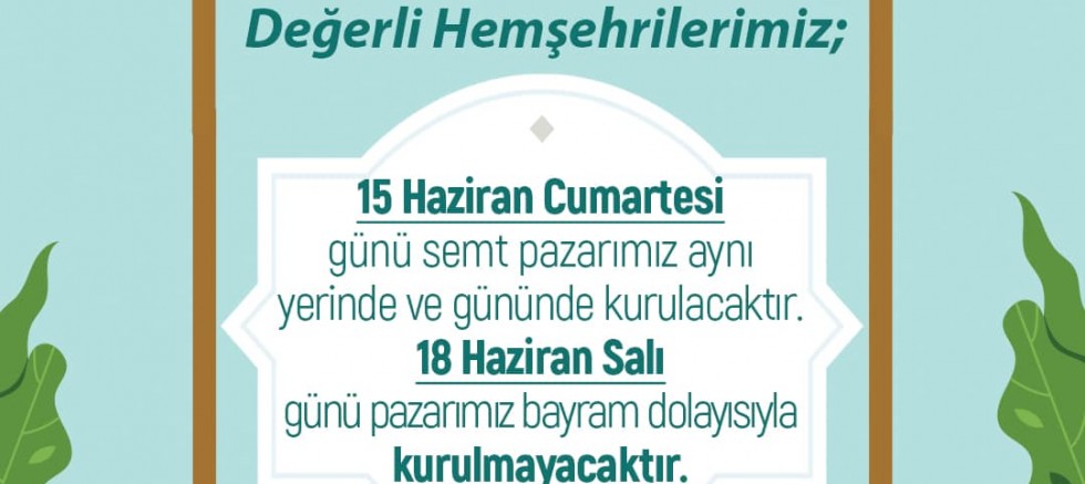 Gelibolu Belediyesi tarafından yapılan duyuruda; “15 Haziran Cumartesi günü semt pazarımız aynı yerinde ve gününde kurulacaktır. 18 Haziran Salı günü pazarımız bayram dolayısıyla kurulmayacaktır. Tüm vatandaşlarımıza duyurulur” denildi.