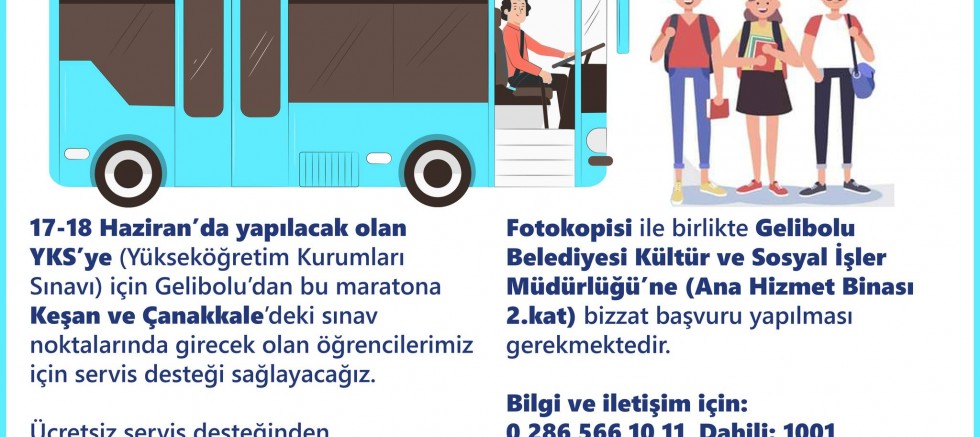 Ücretsiz servis desteğinden yararlanabilmek için 13 Haziran Salı mesai bitimine kadar Sınav Giriş Belgesi ve Nüfus Cüzdanı Fotokopisi ile birlikte Gelibolu Belediyesi Kültür ve Sosyal İşler Müdürlüğü’ne (ana hizmet binası 2. kat) bizzat başvuru yapılması gerekmektedir.