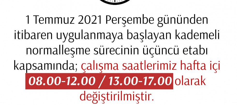 Kamu kurum ve kuruluşlarının çalışma saatlerine ilişkin alınan karar gereği; belediye mesai saatlerinin 08:00-12:00//13:00:17.00 olarak değiştirildiği belirtilen duyuruda; “1 Temmuz 2021 Perşembe gününden itibaren uygulanmaya başlayan kademeli normalleşme sürecinin üçüncü etabı kapsamında; çalışma saatlerimiz hafta içi 08.00-12.00 / 13.00-17.00 olarak değiştirilmiştir” ifadelerine yer verildi.
