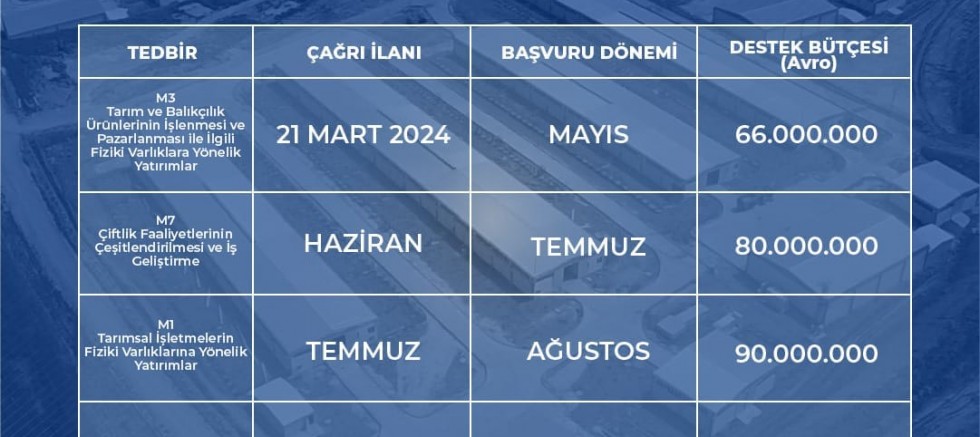 Çiftlik Faaliyetlerinin Çeşitlendirilmesi sektöründe başvuru yapacak projeler için başvuru tarihi Haziran-Temmuz 2024 (ilan edilecektir),