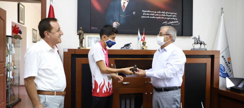 Başkan Özacar, ayrıca dünya üçüncüsü olan Abdullah Yıldırım’a hediye takdim etti.