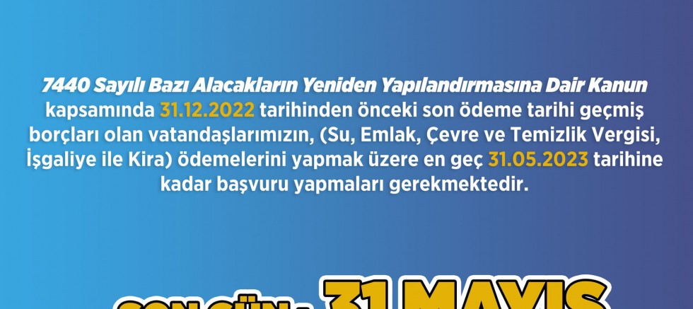 Borçların yapılandırılması ile ilgili Gelibolu Belediyesinden yapılan duyuruda; “7440 sayılı kanun kapsamında vatandaşlarımızın Belediyemize olan 2022 yılı öncesindeki borçlarını yapılandırması için başvurular devam ediyor. 7440 Sayılı Bazı Alacakların Yeniden Yapılandırmasına Dair Kanun kapsamında 31.12.2022 tarihinden önceki son ödeme tarihi geçmiş borçları olan vatandaşlarımızın (su, emlak, çevre temizlik vergisi, işgaliye ile kira) ödemelerini yapmak üzere en ge. 31.05. 2023 tarihine kadar başvuru yapmaları gerekmektedir” denildi.
