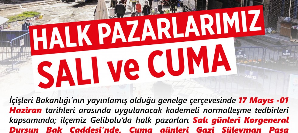 Gelibolu Belediyesi tarafından yapılan duyuruda; “İçişleri Bakanlığı’nın yayınlamış olduğu genelge çerçevesinde 17 Mayıs-01 Haziran tarihleri arasında uygulanacak kademeli normalleşme tedbirleri kapsamında; ilçemiz Gelibolu halk pazarları Salı günleri Korgeneral Dursun Bak Caddesi’nde, Cuma günleri Gazi Süleyman Paşa Mahallesi Emek Caddesi’nde kurulacak ve saat 19.00’da kapatılacaktır. Değerli halkımızın bilgisine sunarız” denildi.
