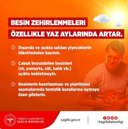 Besin zehirlenmelerinin özellikle yaz aylarında arttığı belirtilen uyarıda şu ifadelere yer verildi; “Besin zehirlenmeleri özellikle yaz aylarında artar. Dışarıda ve açıkta satılan yiyeceklerin tüketiminden kaçının. Çabuk bozulabilen besinleri (et, yumurta, süt, balık vb.) açıkta bekletmeyin. Besinlerin hazırlanması ve pişirilmesi esnasında temizlik kurallarına uymaya özen gösterin”