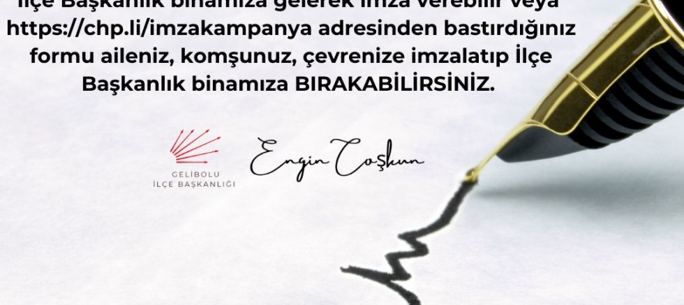 İlçe Başkanlık binamıza gelerek imza verebilir veya https://chp.li/imzakampanya adresinden bastırdığınız formu aileniz, komşunuz, çevrenize imzalatıp İlçe Başkanlık binamıza bırakabilirsiniz” dedi.