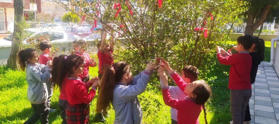 Baharın gelişini müjdeleyen, tabiatın canlandığı Nevruz müjdesiyle okul bahçesine çıkan müdür Cem Kayalı, öğretmenler ve okul çalışanları çevreye olan duyarlıkları nedeniyle biraz da rüzgarın olması üzerine ateş yakmadan sınıfları süsleyip, yaptıkları resimleri okul panosuna astılar. Sonra da, okul bahçesindeki ağaçlara ellerindeki kırmızı kurdeleleri dilek dileyip ağaçların dallarına astılar.