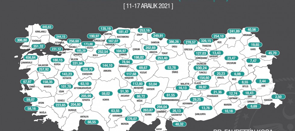 Sağlık Bakanı Koca, Twitter'daki hesabından, 11-17 Aralık arasında illere göre her 100 bin kişide görülen Covid-19 vaka sayılarının güncellendiği haritayı ve vaka sayısı en çok artan illerin listesini paylaştı. Sağlık Bakanlığı’nın illere göre haftalık vaka sayısı haritasında nüfusa oranla en fazla vakanın görüldüğü il 100 bin kişide 456,84 ile Çanakkale oldu.