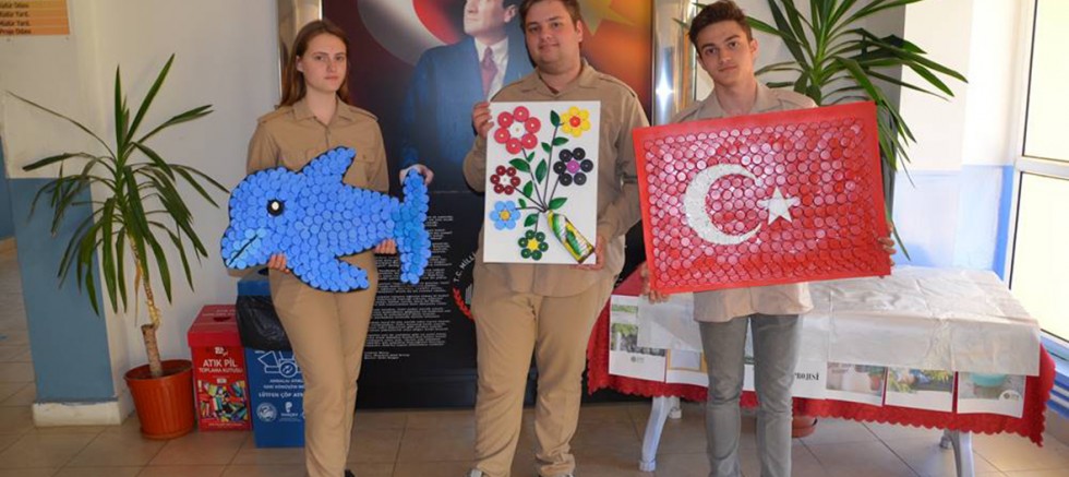 İlçemiz okullarından Armatör Yakup Aksoy Mesleki ve Teknik Anadolu Lisesi öğretmen ve öğrencileri atık mavi kapaklardan Türk bayrağı, Yunus ve çiçek yaparak geri dönüşüm sağladılar.