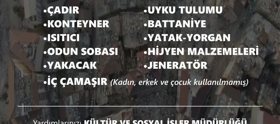 Deprem bölgesine yapılacak yardımların Kültür ve Sosyal İşler Müdürlüğü Sosyal Hizmetler Birimi Deposu’na teslim edilebileceğini belirten Belediye Başkanı Mustafa Özacar; “Bölgeden gelen bilgiler ve yapılan tespitler doğrultusunda depremzedelerin ihtiyaç duyduğu malzemeler görselde belirtilen şekildedir. Yardımlarınızda bu ihtiyaçlara öncelik verilmesini rica ediyoruz” dedi.