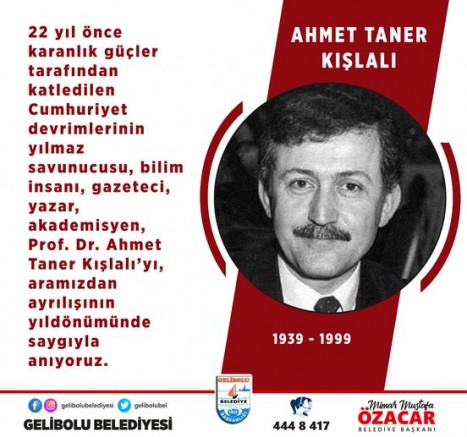 Belediye Başkanı Mustafa Özacar, Cumhuriyet Gazetesi yazarı Prof. Dr. Ahmet Taner Kışlalı’nın ölüm yıl dönümü dolayısı ile bir anma mesajı yayınladı.