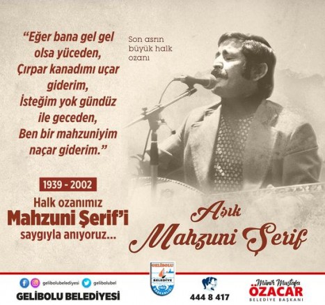 İlçemiz Belediye Başkanı Mustafa Özacar, unutulmaz eserleri ile gönüllerde taht kuran bu toprakların yetiştirdiği değerli halk ozanı Aşık Mahzuni Şerif’in 21’inci ölüm yıldönümü nedeniyle bir mesaj yayımladı.