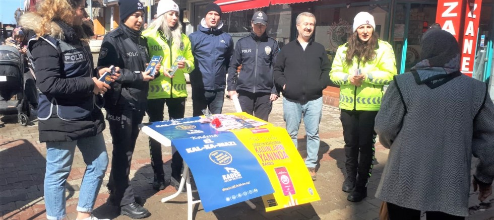 İlçemizde, 8 Mart Dünya Kadınlar Günü dolayısıyla Emniyet Müdürlüğü’ne bağlı Polisler, caddelerde kadınlara karanfil ile broşür, erkeklere de sadece broşür dağıttı.