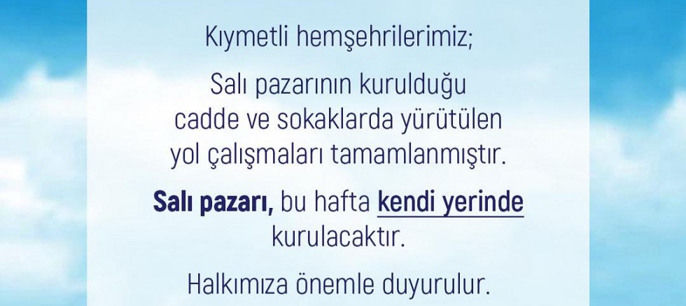 Salı pazarı ile ilgili belediyeden yapılan duyuruda; “Kıymetli hemşehrilerimiz; Salı pazarının kurulduğu cadde ve sokaklarda yürütülen yol çalışmaları tamamlanmıştır. Salı pazarı, bu hafta kendi yerinde kurulacaktır.
