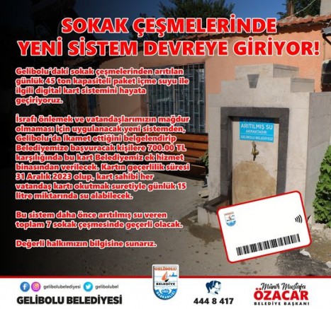 Gelibolu Belediyesi tarafından arıtılmış su akan 7 sokak çeşmesinden yeni sisteme geçilerek digital kartla su alınabileceği duyuruldu. Belediye tarafından yapılan duyuruda; “Gelibolu’daki sokak çeşmelerinden arıtılan günlük 45 ton kapasiteli paket içme suyu ile ilgili digital kart sistemini hayata geçiriyoruz.