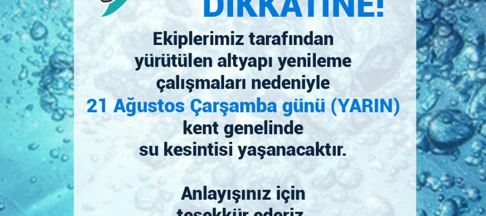 Belediye tarafından yapılan duyuruda; “Ekiplerimiz tarafından yürütülen altyapı yenileme çalışmaları nedeniyle 21 Ağustos Çarşamba günü (yarın) kent genelinde su kesintisi yaşanacaktır.