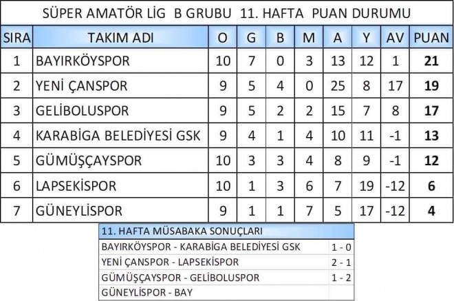 Maç fazlasıyla Lider Bayırköyspor’un bu hafta maçı yok. Önümüzdeki hafta Geliboluspor ligden çekilen Güneylispor karşısında 3-0 hükmen kazanacak. Bayırköyspor deplasmanda Gümüşçayspor ile Y.Çanspor ise evinde Karabiga Bld. GSK ile karşılaşacak.