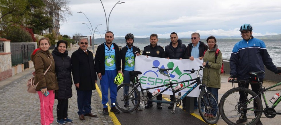 Eşpedal Çanakkale Temsilciğinden Tayfun Tezcan, Şevket Akçahasan dün ilçemize gelerek düzenlenen etkinliğe katıldı. Eşpedal sporcuları bir Co-pilot, bir tandem sürücüsü ve bir destek bisikletlisi olan grup dün ilçemize gelerek engelli bireylerin, açık alanda spor yapma, yaşadığı şehri ve doğayı gezerek tanıma amacıyla bisiklet sürüşü yapan Eşpedal Derneği üyelerini Gençlik ve Spor İlçe Müdürlüğü yetkilileri karşıladı. Belediye Başkanı Mustafa Özacar, İlçe Emniyet Müdürü Şafak Özkan, İlçe Jandarma Komutanı Cem Gökdemir etkinliğe katıldı.