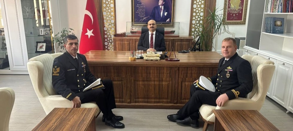 TCG Nusret gemisi personelinden TCG Nusret gemisinin personellerinden Dz. Utğm. Ramazan Yıldız ve Por. Asb. Kd. Bşçv. Mustafa Kuran, ilçemiz Kaymakamı Bekir Abacı'yı makamında ziyaret etti.
