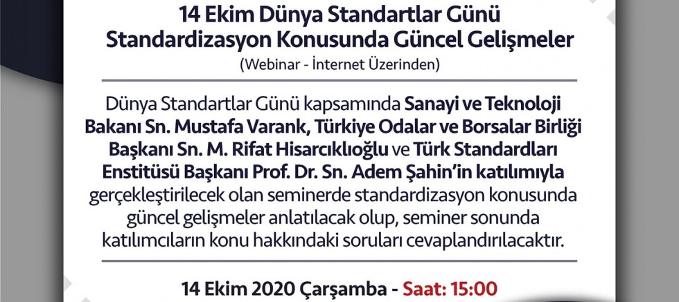 Gerçekleştirilecek olan “14 Ekim Dünya Standartlar Günü - Standardizasyon Konusunda Güncel Gelişmeler Webinarı”na katılımınızı bekliyoruz. Detaylar: https://webinar.tobb.org.tr’de” ifadelerine yer verildi.