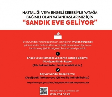Ak Parti İlçe Başkanlığı seyyar sandıklarında oy kullanabilmek için 4-17 Ocak 2019 tarihleri arasında hastalığı sebebiyle yatağa bağımlı olan seçmenlerin bir yakını tarafından Seyyar Sandık Kurulu Talep Formu ile İl Seçim Kurulu Baş-kanlığı’na gönderilmek üzere Muhtarlığa baş-vurmaları gerekiyor.