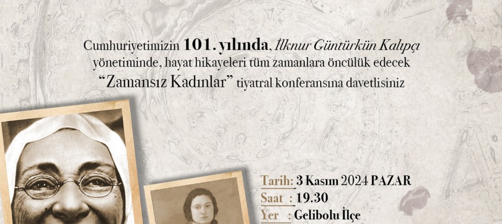Gelibolu Belediyesi ve Gelibolu Öncü Kadın Üretim Kooperatifi tarafından ortaklaşa düzenleceyeceği etkinlik ile Araştırmacı yazar İlknur Güntürkün Kalıpçı’nın hazırlayıp sunacağı "Zamansız Kadınlar" isimli tiyatral konferansı tiyatro severlerle buluşacak.